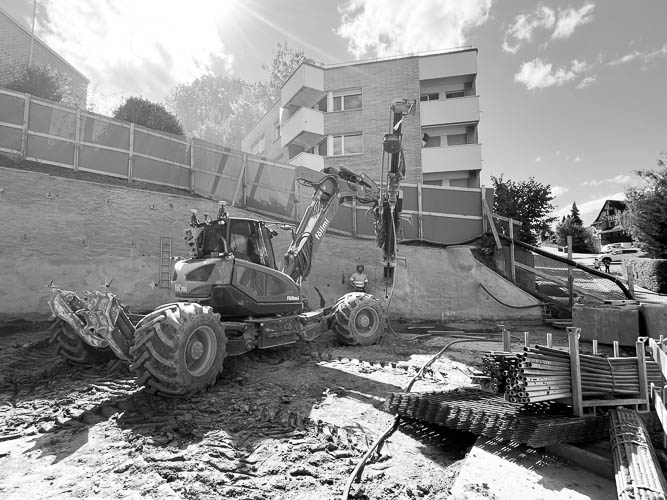 Für den Aushub des Projekts wird eine ca. 10m hohe Nagelwand erstellt. Momentan wird die 3. Lage der Nägel eingebracht.